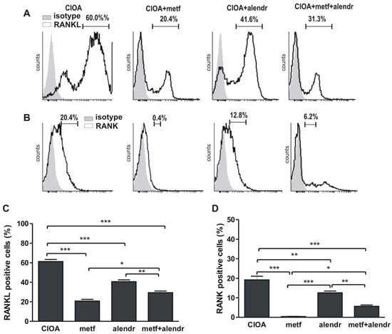 Flow cytometry data. (A) Percentage of RANKL+ cells. (B) Percentage of RANK+ cells. (C) Figure data of (A). (D) Figure data of (B). Data are means ± SD from three determinations (n = 10 per group). * p < 0.05; ** p < 0.01, *** p < 0.001, one-way ANOVA. (CIOA = collagenase-induced osteoarthritis; metf = metformin; alendr = alendronate).