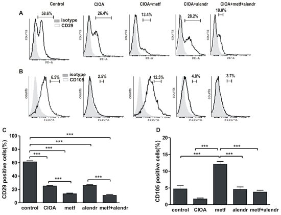 Flow cytometry data. (A) Percentage of CD29+ fibroblast-like cells. (B) Percentage of CD105+ mesenchymal cells. (C) Figure data of (A). (D) Figure data of (B). Data are means ± SD from three determinations (n = 10 per group). *** p < 0.001, one-way ANOVA. (CIOA = collagenase-induced osteoarthritis; metf = metformin; alendr = alendronate).