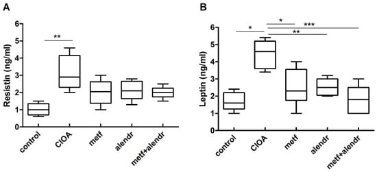 Serum resistin (A) and leptin (B) levels at day 30 of CIOA. Data are means ± SD from three determinations (n = 10 per group). * p < 0.05, ** p < 0.01, *** p < 0.001, one-way ANOVA. (CIOA = collagenase-induced osteoarthritis; metf = metformin; alendr = alendronate).
