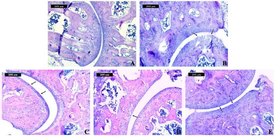 In the control group, we observed normal joint morphology (Table 1, Figure 4A). In this group, we found normal histological architecture of the joint, where the matrix and chondrocytes were organized into superficial, mid, and deep zones.