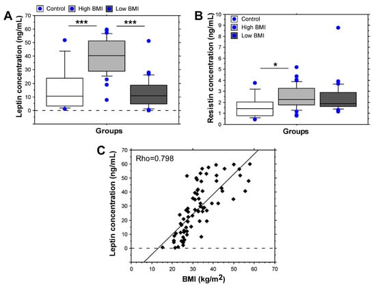 Leptin and resistin serum levels in knee OA patients. (A) Leptin concentration; (B) resistin concentration; (C) correlation between leptin serum levels and BMI; * p < 0,05; *** p < 0.001.