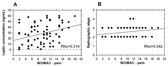 A positive correlation between the levels of leptin and WOMAC-pain score was observed (Rho = 0.314) (Figure 2A), as well as between WOMAC-pain score and radiographic stage (Rho = 0.342) (Figure 2B). A significant association between resistin levels and WOMAC-pain score was not found (Rho = 0.121).