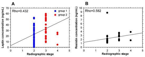 Radiographic stage correlations. (A) An association with leptin serum levels (group 1—2nd radiographic stage, group 2—3rd and 4th radiographic stage). (B) A correlation with resistin serum levels in patients with BMI < 30 kg/m2.