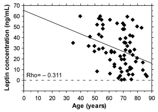 In the current study, a decrease in leptin with the age was found. Similarly, in 470 healthy subjects (150 men and 320 women), Isidori et al. (2000) observed a gradual decline in leptin levels during aging and the reduction was greater in women than in men; it was independent of BMI and other age-related endocrine changes [41].
