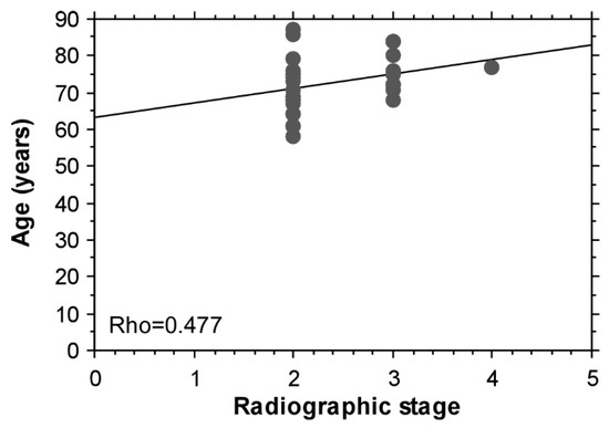 A decrease of leptin with age was found (Rho = −0.311) (Figure 4). An association between age and the radiographic stage of OA was found only in the subgroup of patients with BMI < 30 kg/m2 (Rho = 0.477) (Figure 5).