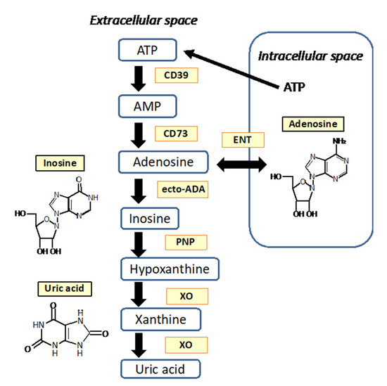 Adenosine in neuronal systems follows a well-recognized metabolic pathway (Figure 1) breaking down into inosine through the activity ADA [88] with the clearance mediated via nonconcentrating nucleoside transporters. It has been suggested that, whereas neurons are enriched in adenosine kinase, ADA is more abundant in astrocytes [62,88]. The end metabolite in humans, uric acid (UA), is well known to have antioxidant properties [89,90,91].