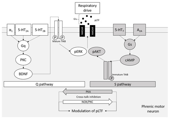 Moderate AIH (mAIH) initiates pLTF via the Q pathway to pMF activity. It is called the Q pathway because it is induced by spinal Gq protein-coupled serotonin 2 (5-HT2) metabotropic receptors [128,137,141,142,143,144]. The Q pathway also requires downstream extracellular signal-related protein kinase (ERK) mitogen extracellular kinase (MEK) activity and new protein synthesis of BDNF [145,146]. New BDNF synthesis leads to activation of its receptor, tropomyosin-related kinase B (TrkB), and protein kinase C theta (PKCθ) activity [145,147,148,149,150]. When AIH is severe (sAIH), pLTF activation’s dominant mechanism is through the S pathway to pMF activity [128,151]. The S pathway is initiated by Gs-coupled metabotropic receptors that require A2AR or 5-HT7 receptor activation [151,152,153]. When pLTF is elicited via the adenosine-dependent mechanism, it is independent of 5-HT receptor activation [146]. The Gs protein-coupled adenosine A2AR (GsPCRs) activation induces a downstream signaling cascade that requires exchange protein activated by cAMP (EPAC), protein kinase b (pAkt) signaling via phosphatidylinositol 3-kinases (PI3K) and new protein synthesis of immature tropomyosin-related kinase B isoform rather than BDNF [152,153,154].