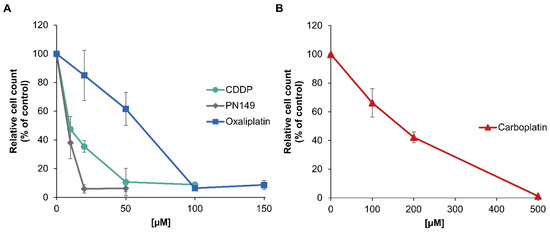 The three clinically approved platinum-based compounds cisplatin, carboplatin and oxaliplatin and the experimental drug PN149 were used. An infusion solution of cisplatin with a concentration of 1 g/L was kindly provided by the Clinical Centre Karlsruhe. Infusion solutions of carboplatin and oxaliplatin were purchased from Accord Healthcare Limited (Middlesex, UK) with a respective concentration of 10 mg/mL and 5 mg/mL. PN149 was synthesized at the Institute of Problems of Chemical Physics of the Russian Academy of Sciences. Incubation times with the platinum compounds were based on the excretion time of cisplatin in patients. Cisplatin shows a 3 phase kinetic excretion with a first half-life time (t1/2α) of 14–49 min followed by a second half-life period (t1/2β) of 0.7–4.6 h and a third half-life period (t1/2γ) of 24–127 h [32,33]. To be in line with the clinical conditions, an incubation time of 24 h was chosen for the experiments, with the exception of intracellular platinum accumulation studies, which were performed for 2 h. Concentrations of the compounds were chosen based on the blood plasma levels measured in patients after drug treatment. The concentration of cisplatin ranged from 10–50 µM. Due to its slower reaction kinetics compared to cisplatin, the concentration of carboplatin ranged from 100 to 500 µM, whereas oxaliplatin is clinically used in a similar range to cisplatin [32,34].