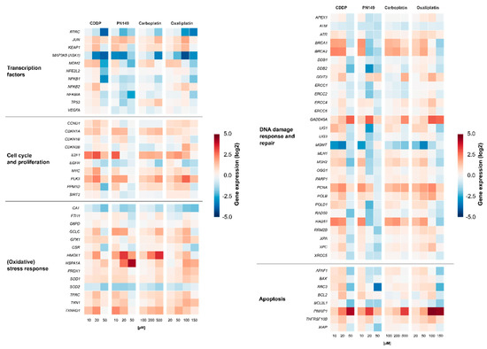 Gene expression profiles were generated to identify the cellular response of the experimental compound PN149 in comparison to the established chemotherapeutic drugs cisplatin, carboplatin and oxaliplatin in kidney proximal tubule cells. It is well understood that, due to its relatively high reactivity, cisplatin induces different cellular signaling pathways, which will ultimately lead to cell death [13]. Important signaling pathways that are implicated in cisplatin-induced nephrotoxicity are, among others, the MAPK signaling cascade as well as the p53 signaling cascade [61]. Detailed studies on the effect of platinum-based chemotherapeutics on renal cells and the involved signaling pathways, however, are rare. Comparative analysis of the expression of genes related to cellular transport, DNA repair and apoptosis was carried out in PTECs of the rat [48], while for human PTECs only data obtained for cisplatin are available [62]. We therefore extended these studies in ciPTECs. ciPTECs were treated for 24 h with different concentrations of the respective platinum compound, followed by quantitative high-throughput RT-qPCR to generate gene expression profiles of selected genes. The analyzed genes were clustered into groups of transcription factors, DNA damage response (DDR) and repair, cell cycle control, (oxidative) stress response and apoptosis. Relative gene expressions were calculated by normalizing the treated samples to the untreated control and are expressed as log2 values. The gene expression profiles are presented in a heatmap in Figure 3.