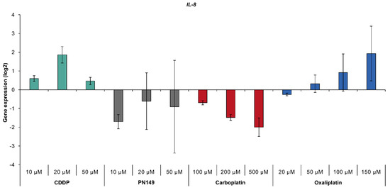 Gene expression of IL-8 gene. ciPTECs were treated with PN149 or cisplatin (10, 20, 50 µM), carboplatin (100, 200, 500 µM) or oxaliplatin (20, 50, 100 and 150 µM) for 24 h. Gene expression was determined by high-throughput RT-qPCR. Shown are the log2 mean values of three independent experiments normalized to the untreated control, whereby the control equals 0.