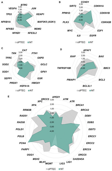 ciPTECs and normal kidney cells were treated with 20 µM cisplatin for 24 h, and gene expression analysis was performed with high-throughput RT-qPCR. Genes were grouped into the clusters of transcription factors (A), cell cycle and proliferation (B), oxidative stress response (C), apoptosis (D) and DNA damage response/repair (E). Gene clusters were arranged in network diagrams.