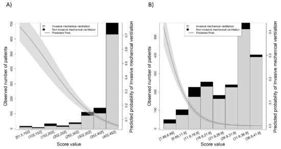 Observed number of cases for each of the scores: (A) SpO2/FiO2 ratio, (B) ROX index. The grey shadowed area shows the predicted probability of the outcome.