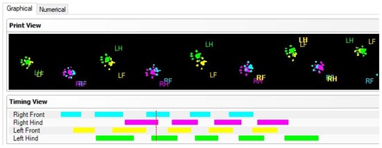 Although the contour of the body is visible on the CW images (Figure 3), it is not considered a print. Only the light footprints (in green) are calculated. Moreover, some parameters such as the run duration (s), average speed of run (cm/s), and maximum variation of speed (%) can be obtained without the selection and classification of paw prints.