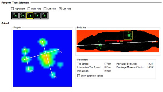 The paw print classification results are expressed either graphically or numerically (Figure 3). A paw print measurement involves the evaluation of three parameters, including the print length (PL), toe spread (TS), and intermediate toe spread (ITS) (Figure 3). Paw print measurements provide data on the length of the print, the distance between the toes, and the position of the foot relative to the body of the animal.