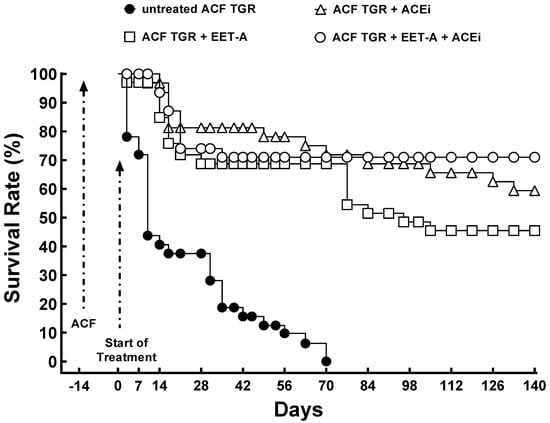 Given the advantages of the described experimental models and availability of 14,15-EETs analog [disodium (S)-2-(13-(3-pentyl)ureido)-tridec-8(Z)-enamido)succinate, EET-A], which was previously found to be suitable for long-term in vivo studies [21,38,39,40], we first aimed to examine effects of chronic EET-A treatment on the morbidity and mortality in ACF TGR and compare it with the standard pharmacological blockade of the RAS with angiotensin-converting enzyme (ACE) inhibitor (ACEi), as described earlier [30,37,41].