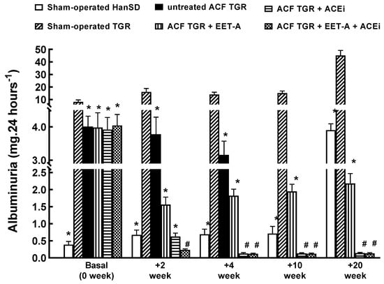 All treatment regimens further reduced albuminuria in ACF TGR, but the treatments with ACEi, alone or combined with EET-A, were more effective than EET-A alone. In fact, the values of albuminuria at the end of the study were even lower than in the sham-operated HanSD rats at the start of the study (0.14 ± 0.02 and 0.13 ± 0.02 vs. 3.9 ± 0.2 mg/24 h, respectively; p < 0.05 in both cases, Figure 3).