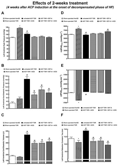 Figure 4. Part 1 of the left ventricular cardiac function assessment by invasive hemodynamic analysis performed 4 weeks after creation of the aorto-caval fistula (ACF) and 2 weeks after initiation of treatment in sham-operated transgene-negative Hannover Sprague-Dawley rats (HanSD), sham-operated heterozygous Ren-2 transgenic rats (TGR) and TGR rats with ACF, untreated or treated with angiotensin-converting enzyme inhibitor (ACEi) alone or with 14,15-epoxyeicosatrienoic acid analog (EET-A) alone or with the combination of EET-A and ACEi. Left ventricle peak pressure (A), left ventricle end-diastolic pressure (B), left ventricle end-diastolic volume (C), maximum rates of pressure rise (+dP/dt)max (D), maximum rates of pressure fall (-dP/dt)max (E), relaxation constant tau (F). * p < 0.05 sham-operated TGR versus sham-operated HanSD rats. # p < 0.05 for untreated ACF TGR versus sham-operated TGR. @ p < 0.05 versus untreated ACF TGR.