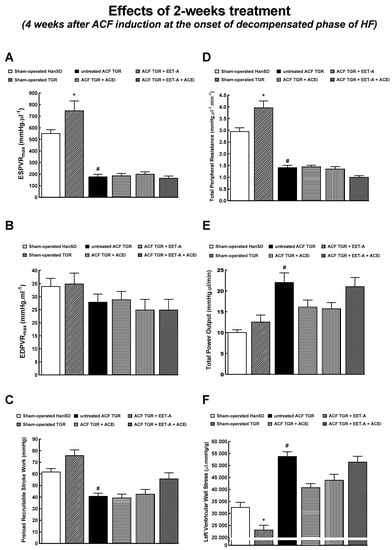 Figure 5. Part 2 of the left ventricular cardiac function assessment by invasive hemodynamic analysis performed 4 weeks after creation of the aorto-caval fistula (ACF) and 2 weeks after initiation of treatment in sham-operated transgene-negative Hannover Sprague-Dawley (HanSD), sham-operated heterozygous Ren-2 transgenic rats (TGR) and TGR rats with ACF, untreated or treated with angiotensin-converting enzyme inhibitor (ACEi) alone or with 14,15-epoxyeicosatrienoic acid analog (EET-A) alone or with combination of EET-A and ACEi. End-systolic pressure-volume relationship (ESPVR) (A), end-diastolic pressure-volume relationship (EDPVR) (B), preload recruitable stroke work (C), total peripheral resistance (D), total power output (E), left ventricular wall stress (F). * p < 0.05 for sham-operated TGR versus sham-operated HanSD rats. # p < 0.05 for untreated ACF TGR versus sham-operated TGR.