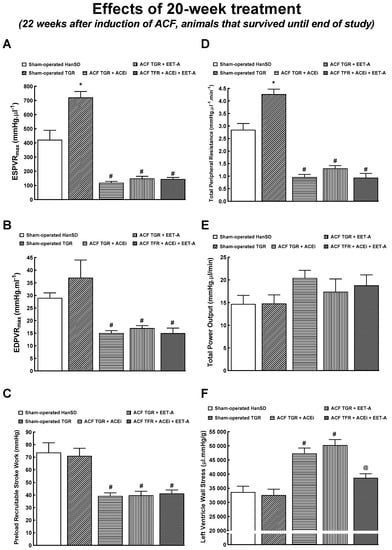 Figure 8. Part 2 of the left ventricular cardiac function assessment by invasive hemodynamic analysis performed 22 weeks after creation of the aorto-caval fistula (ACF) and 20 weeks after initiation of treatment in sham-operated transgene-negative Hannover Sprague-Dawley (HanSD), sham-operated heterozygous Ren-2 transgenic rats (TGR) and TGR rats with ACF, untreated or treated either with angiotensin-converting enzyme inhibitor (ACEi) alone or with 14,15-epoxyeicosatrienoic acid analog (EET-A) alone or with the combination of EET-A and ACEi. End-systolic pressure-volume relationship (ESPVR) (A), end-diastolic pressure-volume relationship (EDPVR) (B), preload recruitable stroke work (C), total peripheral resistance (D), total power output (E), left ventricular wall stress (F). * p < 0.05 sham-operated TGR versus sham-operated HanSD rats. # p < 0.05 for ACF TGR versus sham-operated TGR. @ p < 0.05 versus other ACF TGR.