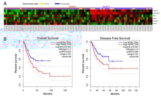 Transcriptomic profiling and survival analysis. (A) Expression profiles of genes associated with the progression of UBUC (T2-4 vs. Ta-1) focusing on JNK cascade from a published transcriptome (GSE31684) in Gene Expression Omnibus. ROR2 is the most significantly upregulated gene. (B) Using GEPIA databases, high ROR2 expression was remarkably related to worse overall survival (p = 0.022) and disease-free survival (p = 0.024) in UBUC.