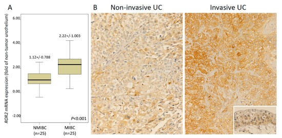 Expression of ROR2 mRNA and protein in urothelial carcinoma specimens. (A) ROR2 mRNA level was significantly increased in MIBC (pT2-T4) using qRT-PCR. (B) Invasive UC showed high ROR2 expression using immunohistochemistry (normal urothelium in the inset) (magnification × 2000).