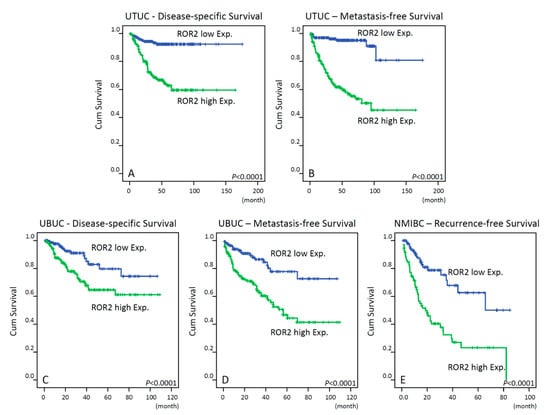 Kaplan–Meier survival analysis shows that ROR2 overexpression has significant prognostic impacts in disease-specific survival, metastasis-free survival, and bladder recurrence-free survival of patients with UTUC (A,B, respectively) and UBUC (C,D, respectively) and bladder recurrence-free survival of patients with NMIBC (E).