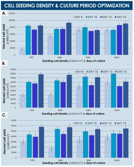Results from the pilot GMP banking campaign for optimization of dermal FPC seeding density, culture vessel surface, and total culture period. Expansion of dermal FPCs at passage 6 took place in standard culture flasks of different surfaces (i.e., (A–C), T175, T225, and T500 flasks, respectively). Expansions were performed using a Sigma® clinical-grade FBS lot and the relative volume of culture medium was of 0.2 mL/cm2. Culture medium was exchanged twice per week. The total number of days in culture was calculated from the time of vessel seeding to the time of confluent (i.e., 100% confluency) cell monolayer harvest. Standard deviations are presented as error bars. Overall optimized conditions (i.e., a compromise between sparing use of resources and consistent quality of manufactured cells) were established with the use of T225 flasks, a cell seeding density of 1.5 × 103 ± 200 cells/cm2, and harvest of confluent cells after 15 days of culture maintenance. FBS, fetal bovine serum; FPC, fibroblast progenitor cells; GMP, good manufacturing practices.