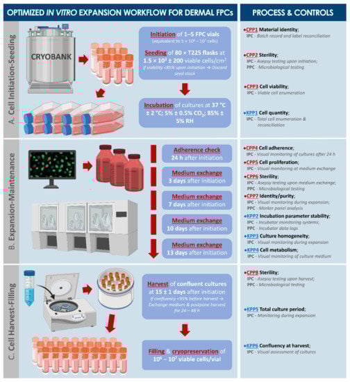In the present work, we report stringently optimized starting biological material sourcing and related multi-tiered biobanking of dermal FPC sources, with specific focus set on manufacturing process definition (i.e., parameters, controls, and ad hoc criteria, Figure 2 and Figure 3).