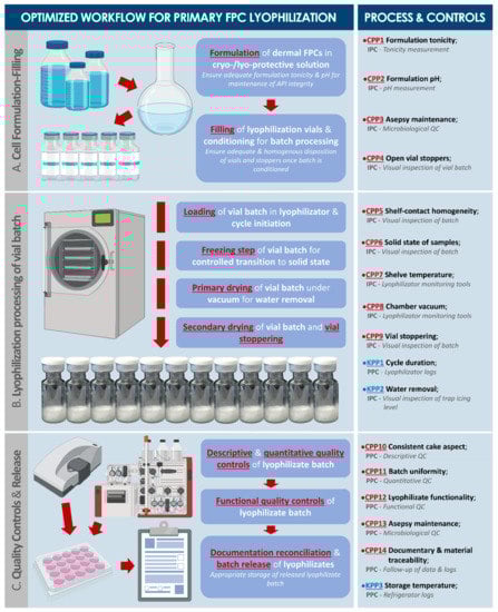 Optimized schematic workflow for primary dermal FPC stabilization by lyophilization. (A) Physico-chemical specifications of unprocessed bulk and of lyophilized products (e.g., final tonicity and pH after reconstitution), defined during the development phase, are critical in maintaining the functionality of processed biological materials and must comply with general requirements of the considered administration route. (B) Adequate primary and secondary drying phases are critical for appropriate stabilization of the considered formulations, by consistently obtaining low residual relative water contents while maintaining cake structural integrity. (C) Definition of controls and related variables for final lyophilized products are highly formulation-dependent and are of critical importance for assurance of batch-to-batch homogeneity. CPPs were defined as parameters exerting a critical effect on the quality of the final lyophilizate batch. KPPs were defined as parameters exerting a key effect on the quality of the final lyophilizate batch. API, active pharmaceutical ingredient; CPP, critical process parameter; FPC, fibroblast progenitor cells; IPC, in-process control; KPP, key process parameter; PPC, post-process control; QC, quality control.