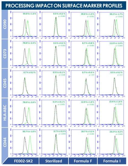 Following production of several batches of lyophilized dermal FPCs using the optimized lyophilization cycle parameters (i.e., presented in Table A3, Appendix A), qualitative and quantitative compositions of obtained preparations were investigated, in order to evaluate the effects of processing on protein contents or detection thereof. Therein, lyophilized batches (i.e., formula M, FE002-SK2 cells suspended in PBS alone, for avoidance of lyophilization mix interference) were analyzed for total protein contents (i.e., BCA assay), in view of the assessment of batch-to-batch uniformity, and by comparative proteomic analysis (i.e., in parallel to fresh cell lysates), to determine the effects of lyophilization processing on the cells of interest at a molecular level (Supplementary Methods). Relatively abundant proteins (i.e., ≥1 mg/mL) or proteins of interest for cutaneous wound healing, detected in one or in both groups (i.e., FE002-SK2 dermal FPCs, processed into fresh cell lysates, and corresponding cell lyophilizates), comprised follistatin, FGF-2, VEGF-A, HGF, TIMP-1, TIMP-2, MMP-1, MMP-2, MMP-3, MMP-13, sgp130, sVEGFR-2, sEGFR, sVEGFR-1, sVEGFR-3, sTNFRI, sIL-1RII, leptin, HB-EGF, IL-8, and TGF-β1 (Supplementary Table S1). Significant modifications (i.e., ≥1 log variation) in detected protein levels were evidenced for follistatin, FGF-2, MMP-3, MMP-13, sgp130, sVEGFR-2, sVEGFR-1, sVEGFR-3, sIL-1RII, leptin, HB-EGF, GRO-a, fractalkine, and TGF-β1, wherein detected protein quantities were systematically relatively more important in the lyophilized cell group (Supplementary Table S1). More generally, for the majority of detected proteins (i.e., detected levels above the individual limits of detection), relative levels were determined to be more important in the lyophilized dermal FPC group (Supplementary Table S1). Finally, comparative FACS analysis of fresh, sterilized, and lyophilized dermal FPCs allowed to outline complete destruction of specified surface markers during sterilization, but relative, partial, and specific conservation thereof following lyophilization (Figure 4).