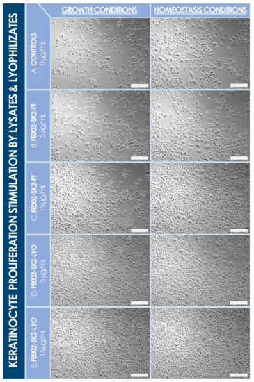 The in vitro stimulatory effects of lyophilized dermal FPCs (e.g., FE002-SK2 cells) were determined, in view of assessing the function of such devitalized and stabilized materials, as compared to corresponding dermal FPC lysates. Specifically, cell lysates and reconstituted lyophilizates (i.e., formula B) were shown to similarly stimulate cellular proliferation of primary keratinocytes when added in final concentrations of 5 µg/mL and 15 µg/mL (i.e., expressed in normalized total protein contents) in the cell culture media (Figure 5, Table 3). Therein, stimulation of cell proliferation was highly comparable in terms of amplitude, considering average cell enumeration data for both assay groups (i.e., cell lysates versus lyophilizates) and in both culture media (i.e., homeostasis versus proliferation medium, Table 3). Conversely, the effects of both cell lyophilizate concentrations (i.e., Figure 5D,E) were photographically recorded as relatively more important than that of corresponding cell lysate concentrations (i.e., Figure 5B,C). Furthermore, cell lyophilizates (i.e., formula M) were found to promote migration of HaCaT cells in a dose-dependent manner in a standardized scratch assay (Figure 6).
