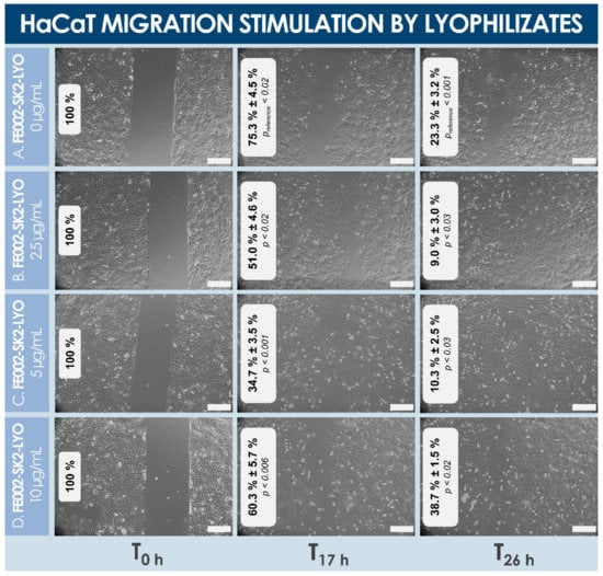 HaCaT cell migration stimulation potential of various doses (i.e., expressed in normalized total protein contents at the final dilution in the culture medium) of dermal FPC (e.g., FE002-SK2 cell type) lyophilizates (i.e., “LYO”, formula M). The culture medium did not contain FBS. Photographic imaging was performed at the time of treatment with the test-items, 17 h later, and 26 h later, respectively. Unpopulated culture surface areas were integrated using ImageJ. (A) Control group. Significant differences (i.e., preference values < 0.05) were found in the remaining relative unpopulated surfaces at T17 h and T26 h as compared to T0 h, respectively. (B) Lyophilizate group at a concentration of 2.5 µg/mL. (C) Lyophilizate group at a concentration of 5 µg/mL. (D) Lyophilizate group at a concentration of 10 µg/mL. Quantitative assessment of remaining relative unpopulated culture surfaces indicated a positive effect of lyophilizates on keratinocyte migration at two investigated doses (i.e., 2.5 and 5 µg/mL), as compared to controls. Higher doses (i.e., 10 µg/mL) of lyophilizate promoted cell migration at T17 h, as compared to controls, but hindered cell migration at the T26 h timepoint, as compared to controls. At both timepoints and at all treatment concentrations, statistically significative differences (i.e., p < 0.05) were found for remaining unpopulated surface values, as compared to corresponding values from the control group (i.e., no treatment). Scale bars = 200 µm. FBS, fetal bovine serum; FPC, fibroblast progenitor cells.