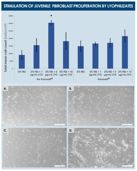 Primary juvenile fibroblast cell proliferation stimulation potential of various doses (i.e., expressed in normalized total protein contents at the final dilution in the culture medium) of dermal FPC (e.g., FE002-SK2 cell type) lyophilizates (i.e., “LYO”, formula M). The culture medium contained 2% v/v FBS. Photographic imaging was performed 48 h following the second treatment with the test-items. (A) Control group, no Transwell® insert. (B) Lyophilizate group at a concentration of 1 µg/mL, no Transwell® insert. (C) Lyophilizate group at a concentration of 5 µg/mL, no Transwell® insert. Note the statistically significant difference in endpoint cell counts in this condition (i.e., p < 0.03), as indicated by the “*” symbol. (D) Lyophilizate group at a concentration of 15 µg/mL, no Transwell® insert. Note the presence of lyophilizate particles adhering to the proliferating cells in this condition. Overall, obtained results suggested that direct cell contact is necessary for the observation of a positive effect of lyophilizates on fibroblast proliferation, but that high product concentrations do not allow observation of this effect because of strong adhesion of product particles to assay cells in vitro. Cell count values are presented as averages, with standard deviations as error bars. Scale bars = 100 µm. FBS, fetal bovine serum; FPC, fibroblast progenitor cells; LYO, lyophilizate.