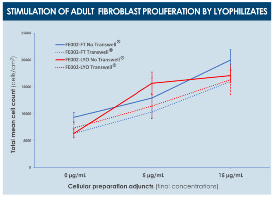 This result suggested that direct contact between the assay cultures and the products was necessary in order for the effect to be measurable. However, higher lyophilizate doses or the presence of a Transwell® membrane did not allow us to conclude on significantly increased fibroblast proliferation, suggesting here again that the stimulatory effects disappear at relatively higher doses, and that the effects exerted by soluble factors alone do not suffice to produce an observable juvenile fibroblast proliferation stimulation (Figure 7). In contrast, the proliferation of adult fibroblasts was significantly and similarly promoted, in a dose-dependent manner and independently from the presence of a culture insert, by the treatment with cell lysates and alternative dermal FPC lyophilizates (i.e., formula I, with cryo-protectants, Figure 8).