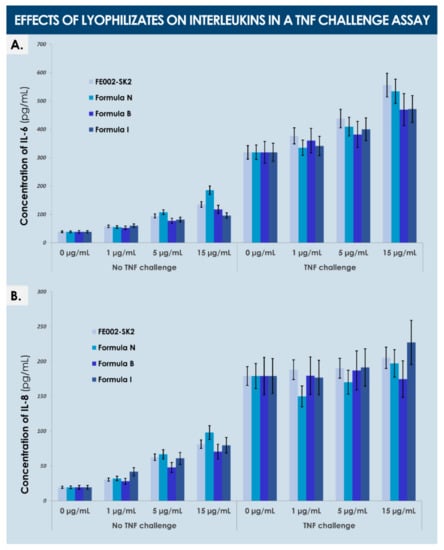Although non-significant, a trend was observed in the assay wells without a culture insert, wherein cell counts were systematically determined to be higher than in corresponding wells with an insert (Figure 8). Finally, analysis of interleukin production by adult fibroblasts after treatment by dermal FPC preparations (i.e., formulas B, I, and N) in a TNF challenge assay showed an increased production (i.e., dose-dependent) of both IL-6 and IL-8 after treatment by lyophilizates in the control groups, an increased production (i.e., dose-dependent) of IL-6 following treatment with various lyophilizates in the TNF group, but no increase of IL-8 levels in the same treatment settings (Figure 9).