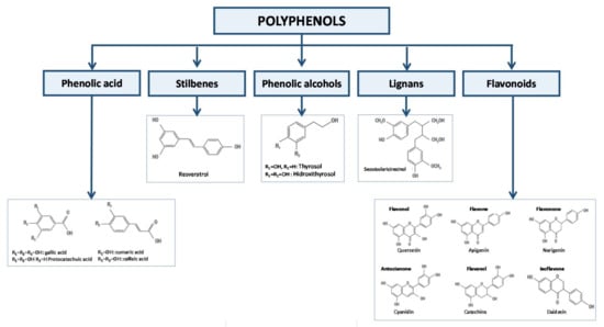 They are abundant in nature and extremely diverse in their molecular structure. They can be found in fruits, leaves, stems, roots, and seeds and to this day, more than 8000 polyphenols have been identified [1]. Therefore, terminology and classification are complex processes. The chemical structures can be divided based on some differences in phenolic acids, stilbenes, phenolic alcohols, lignans, and flavonoids [2] (Figure 1). Furthermore, in nature they can be found in their free form (aglycones), bound to other compounds as sugars (glycosides), or even bound to the extracellular matrix or cell wall.