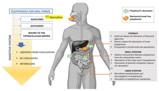 Polyphenols in their free form and in complexes can present changes in the structure of the digestive tract including on a hepatic level. These changes are observed from the liberation of the polyphenol, to its union with complex compounds, to the addition of conjugates, and the generation of metabolites [7]. Additionally, the joint ingestion of other compounds with polyphenols can affect its absorption: fibers, high fat diets, and the consumption of alcoholic beverages have an especially high influence. Finally, as will be discussed in the next sections of this review, polyphenols can be absorbed in the stomach, the intestine, and colon, or be eliminated through feces.