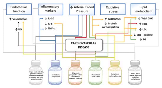 In clinical trials aimed at attributing the therapeutic effect of polyphenols in cardiovascular diseases, the changes in arterial blood pressure (BP), lipid metabolism, endothelial function, and other risk factors were tested as the endpoint results of various interventions.