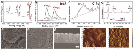According to the XPS data, the Ir(Si) sample after etching (Figure 1a) had the following composition: Ir 87, C 9, O 4 (at.%). Iridium was present mainly in the metallic form Ir0 (binding energy for Ir0 4f7/2 is 60.4 eV) with an admixture of the oxidized form of iridium (binding energy for IrIV 4f7/2 is 63.2 eV) (Figure 1b). The ratio of 4f7/2 peak areas of Ir0:IrIV was 1:0.02, i.e., the content of oxidized iridium was approximately 2% of the total amount. The analysis of the position of C1s peaks after etching showed that carbon was present in the form of sp2-hybridized amorphous graphite (283.9 eV) (Figure 1c). According to the XRD data (Figure 1d), the main crystal phase recorded in the Ir and Ir(Si) samples was FCC-Ir (2θ = 40.8(111), 46.7(200), 68.8(220), JCPDS Card No.: 000-46-1044), while the IrO2 phase in the samples was not recorded within the method error. The XRD pattern of the Ir sample showed low-intensity reflections from the Ti-alloy substrate. Thus, the content of the IrO2 phase in the Ir(Si) and Ir samples was relatively small. The crystallite sizes calculated according to the Debye–Scherrer equation were 12 ± 1 nm and 15 ± 2 nm in the Ir(Si) and Ir samples, respectively. According to SEM data (Figure 1e,f), the surfaces of the Ir(Si) and Ir samples were porous with globule-like agglomerates (0.1–1 µm) and voids (0.01–0.1 µm). The sizes of agglomerates and voids were maximal for the Ir coating on a Ti-alloy substrate (Figure 1f). Iridium coatings had a characteristic dendritic columnar structure with the thickness on a silicon substrate of about 1.4 µm (Figure 1g).