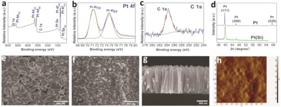 XPS spectra of Pt(Si) sample after etching with Ar+ (a), fitting of Pt 4f spectra (b), and fitting of C1s spectra (c); XRD patterns of Pt and Pt(Si) samples (d); SEM micrographs of the sample surface (Pt (e) and Pt(Si) (f)) and cross-section of Pt(Si) sample (g); AFM micrograph Pt sample (h).