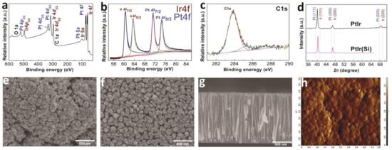 XPS spectra of PtIr(Si) sample after etching with Ar+ (a), fitting of Pt 4f and Ir 4f spectra (b), and fitting of C1s spectra (c); XRD patterns of PtIr and PtIr(Si) samples (d); SEM micrographs of the sample surface (PtIr (e) and PtIr(Si) (f)) and cross-section of PtIr(Si) sample (g); AFM micrograph PtIr(Si) sample (h).