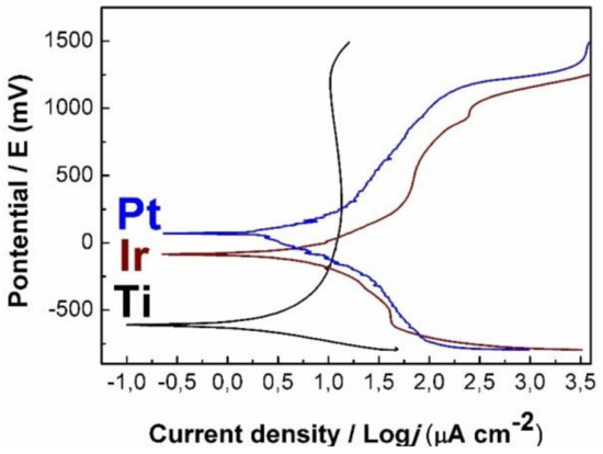 The properties of the corrosion resistance of Ti-alloy substrate, Ir, and Pt films were studied by the method of anodic polarization using a potentiostat–galvanostat P-30J (Elins, Russia). A 3.5 wt.% aqueous solution of NaCl was used as an electrolyte. A standard three-electrode cell with a saturated silver chloride electrode as a reference electrode and Pt electrode (size of 15 × 15 × 0.5 mm3) as a counter electrode was used for electrochemical investigations. The potentiodynamic current–voltage curves were recorded at a sweep rate of 20 mV/min. All experiments were performed at room temperature (25 °C).