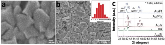 SEM micrographs of the surface of Au/Pt sample (a,b) with AuNP size distribution, and XRD patterns of the series of Au/Si, Au, Au/Ir, Au/Pt, and Au/PtIr samples (c).
