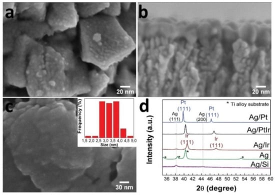 SEM micrographs of the surface of Ag/Pt sample (a) and cross-section of Ag/Ir sample (b), surface of Ag sample on Ti-alloy with AgNPs size distribution (c), and XRD patterns of series of Ag/Si, Ag, Ag/Ir, Ag/Pt, and Ag/PtIr samples (d).