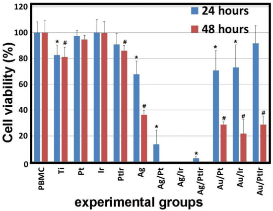 All the studied samples were divided into several experimental groups: Ti-alloy (Ti), Ti-alloy with monophase noble-metal coatings (Pt, Ir, and PtIr), Ti-alloy with monophase Ag coating (Ag), Ti-alloy with heterophase noble-metal coatings containing AuNPs (Au/Pt, Au/Ir, and Au/PtIr), and Ti with heterophase noble-metal coatings containing Ag layers (Ag/Pt, Ag/Ir, Ag/PtIr). The samples of various mono- and heterostructures were shown to have different cytotoxic activity. The samples from the It, Pt, and PtIr groups (three in each group) had the least effect on PBMC after 24 and 48 h of cultivation. In other groups, a significant decrease in cell viability compared to the control (PBMC) group was observed (Figure 7).