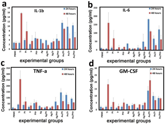 At the same time, experimental samples with gold nanoparticles (Au/Pt, Au/Ir, and Au/PtIr) cocultured with PBMCs caused an increase in cytokine secretion after both 24 and 48 h. The most pronounced changes were observed in the Au/Ir group, where the concentration of IL-1b, IL-6, TNF-a, and GM-CSF increased 4.1-, 17.6-, 8.6-, and 6.5-fold after 24 h and 3.3-, 12.4-, 6.9-, and 12.3-fold after 48 h, respectively. In other groups of gold-containing samples, changes in cytokine secretion had the same tendency (differences with the control group were significant).
