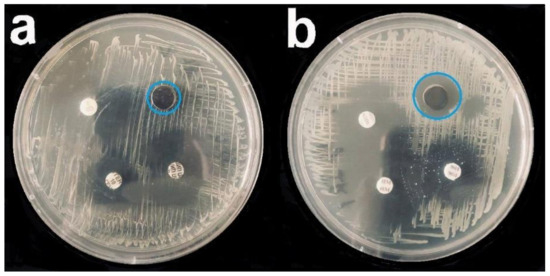 Bacterial growth inhibition assay (P. aeruginosa) for Ir (a) and Ag/Ir (b) samples; blue circle—zone of inhibition. The remaining samples were standard discs with control antibiotics (cefepime, imipenem, and tobramycin).