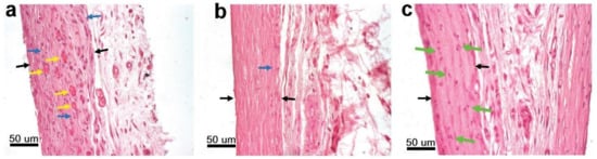 Histological analysis of the samples after 3 months of implantation revealed the presence of lymphocytic infiltration only in the control group Ti-alloy (Figure 10b). The process had minimal activity (0–1 point). This fact is proof of the latent toxicity of titanium, which is the known and most common cause of the development of late postoperative complications and operations for the replacement of titanium implants [59,60].