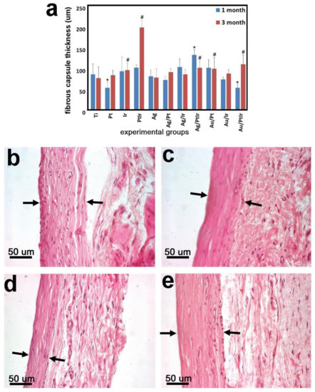 The thickness of the fibrous capsule around experimental samples after 1 and 3 months of subcutaneous implantation in rats (a); # significant differences with the control group (1 month), * significant differences with the control group (3 months). Dynamics of the formation of a fibrous capsule (black arrows—capsule border) around series of experimental samples with AgNPs: Au/Pt 1 month (b), Au/Pt 3 months (c), Au/PtIr 1 month (d), and Au/PtIr 3 months (e).