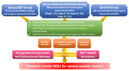 Workflow of this study. The DNA microarray gene expression profiles of 79 serous borderline tumor (BOT) samples, 900 serous ovarian carcinoma specimens including all stages, and 136 normal ovarian controls were downloaded from publicly available databases with gene set regularity (GSR) indices calculated by the Gene Ontology (GO) gene set. Functionomes consisting of 10,192 GO gene sets established from the polygenic models and cumulative portion transformations with machine learning and statistical methods were utilized to identify the functionome-based patterns to investigate dysregulated GO terms, dysfunctional pathways, and biomarkers of epithelial–mesenchymal transition (EMT) together with integrative analysis and to discover potential crucial differentially expressed genes (DEGs).